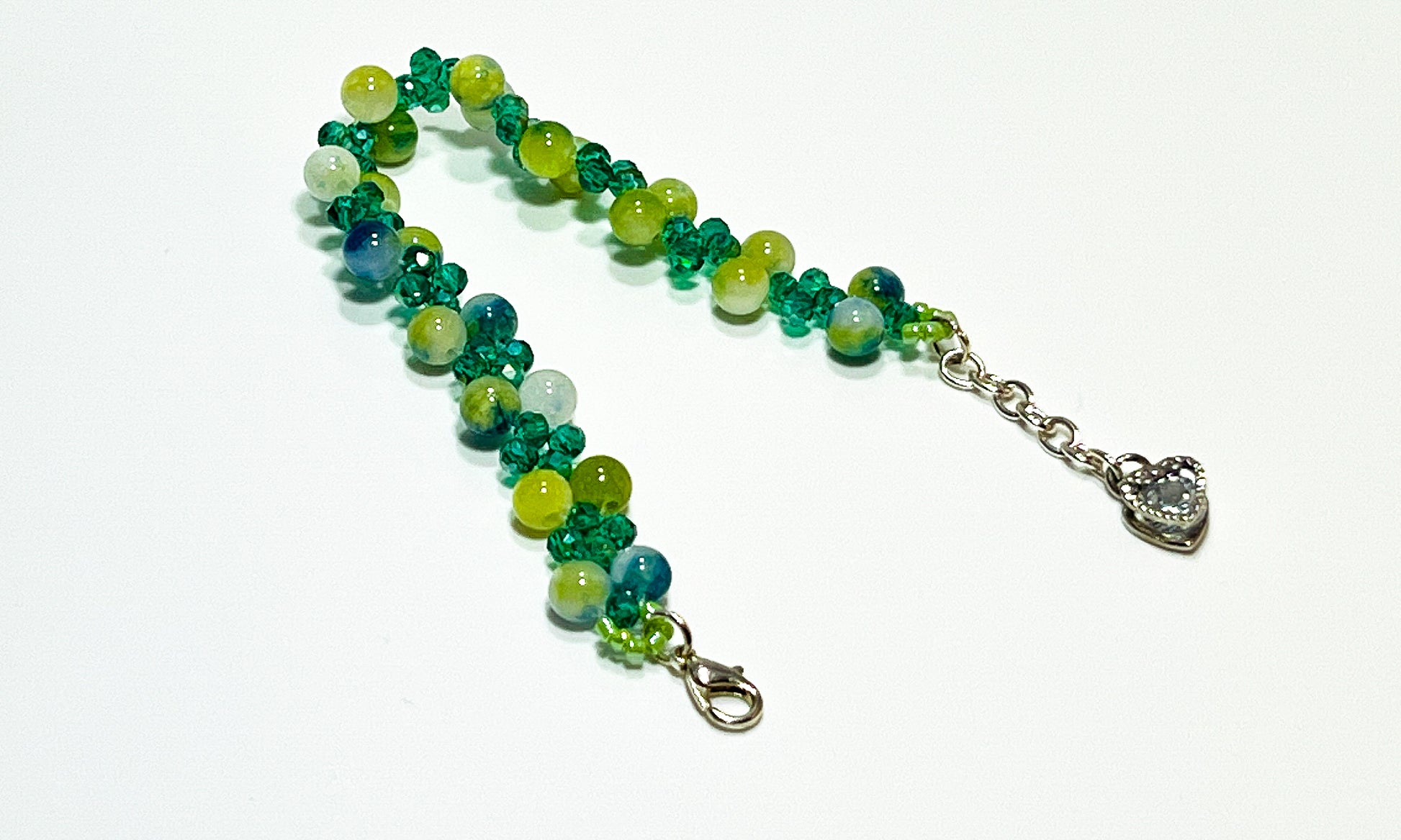 The Jade Forest Glow Bracelet showcases natural blue-green Persian jade stone beads, accented with sparkling glass beads and a silver-plated glass heart charm, evoking the serene beauty of a softly glowing forest.