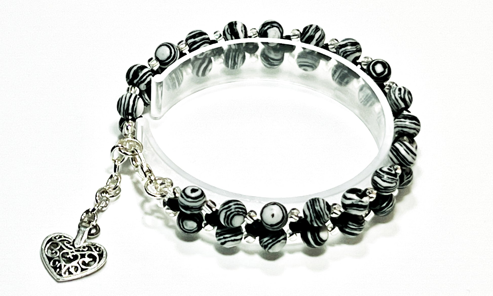 The Silver Frost bracelet features elegant black and white malachite natural stone beads, sparkling crystal glass accents, and a timeless silver heart charm for a touch of sophistication.
