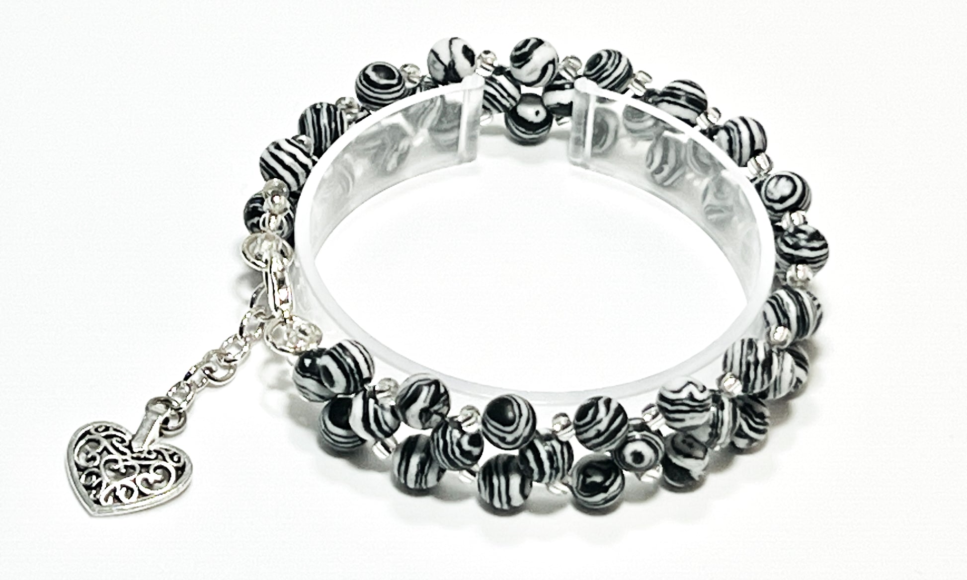 The Silver Starlight bracelet features striking black and white malachite natural stone beads, sparkling crystal glass accents, and a delicate silver heart charm, evoking a timeless celestial elegance.